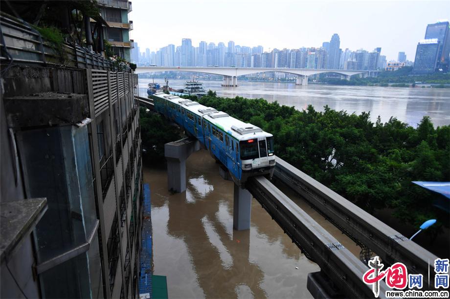 受四川盆地强降雨影响,重庆市嘉陵江流域出现第2号洪水、长江流域出现第5号洪水。8月19日,洪水漫上嘉滨路大溪沟、黄花园到洪崖洞路段,重庆单轨2号线和江面上的轮船一样,行驶在“水上”,成为重庆洪峰浪尖的又一魔幻景观。小顺/IC photo