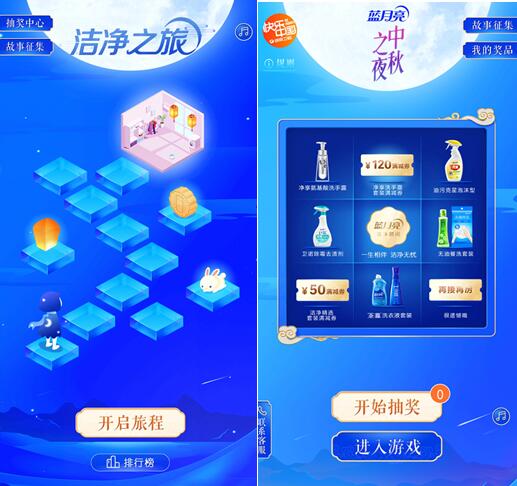 今年,蓝月亮将继续携手湖南卫视,为广大消费者带来独具特色的中秋祝福。目前蓝月亮已推出了“一生相伴 洁净无忧”中秋预热互动H5,消费者只要参与互动,就有机会免费领取净享洗手露、天露洗洁精、卫诺除霉等多款新品,率先成为蓝月亮的新品体验官。此外,蓝月亮今年还特别在互动中增添了洁净之旅小游戏,让大家在趣味游戏中学习洗涤知识,解决日常洗涤难题。