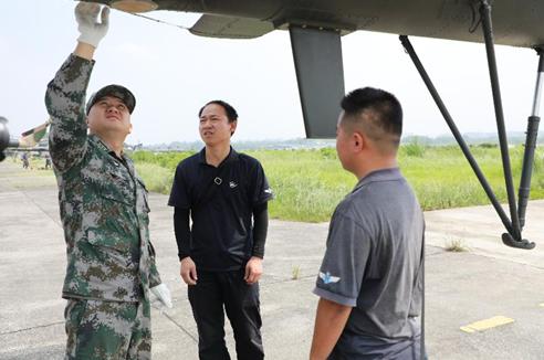 ↑陆军装备部某航空军代局文职军代表刘文法(左一)在大修企业外场实地察看部队机组反映的问题(8月20日摄)。新华社发(董玮 摄)