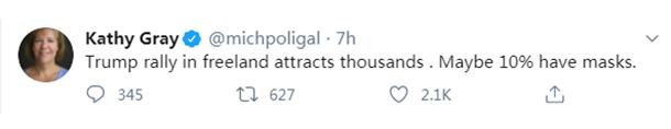 在当天的总统竞选集会现场,《纽约时报》记者凯西·格雷在个人社交媒体上称:“特朗普的竞选集会在弗里兰聚集了数千人,但戴口罩的人却连10%都不到。”