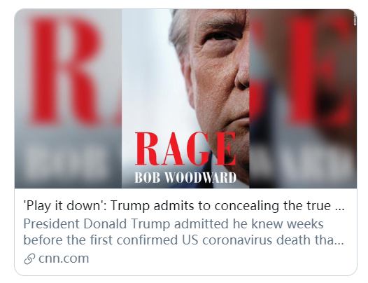 曾揭露“水门事件”的调查记者伍德沃德的新书《愤怒》9月15日将上市,该书记录了伍德沃德从2019年12月5日至2020年7月21日先后18次采访特朗普的内容。其中部分采访录音和内容被提前透露给媒体。