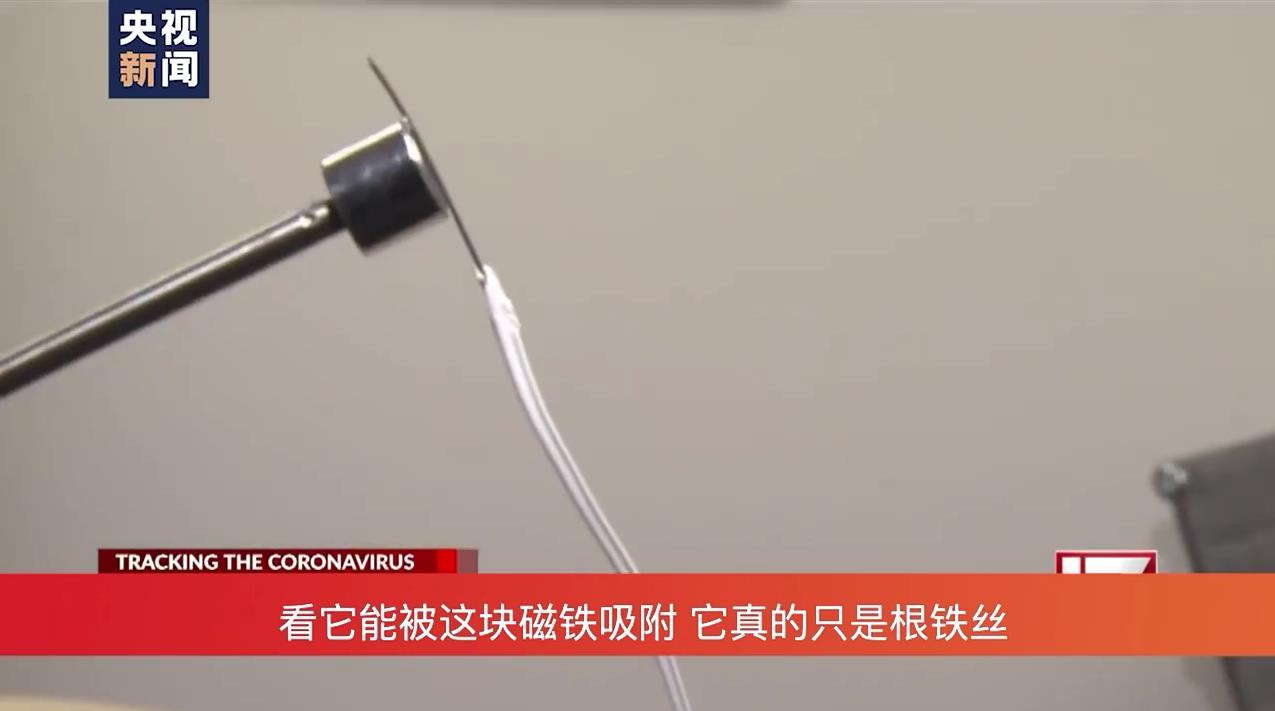 记者在节目中解释称,那条所谓的“5G天线”其实是由塑料包裹住的一根钢丝。并且他还用磁铁演示是如何吸住这根钢丝的。