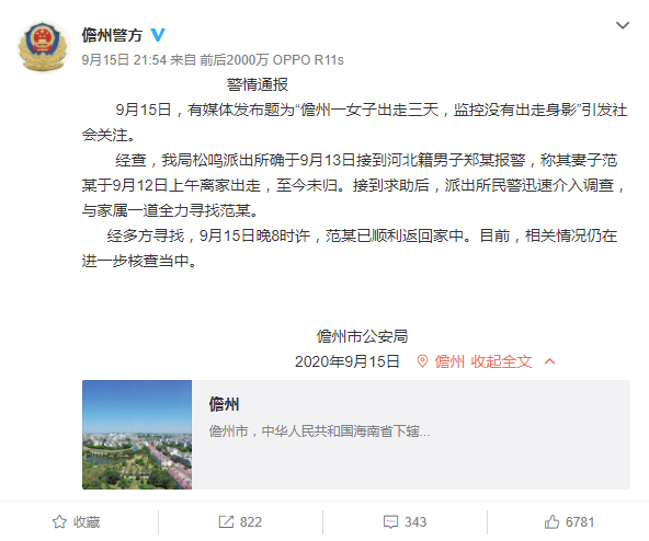 据海南省儋州市公安局官方微博消息,9月15日,有媒体发布题为“儋州一女子出走三天,监控没有出走身影”引发社会关注。