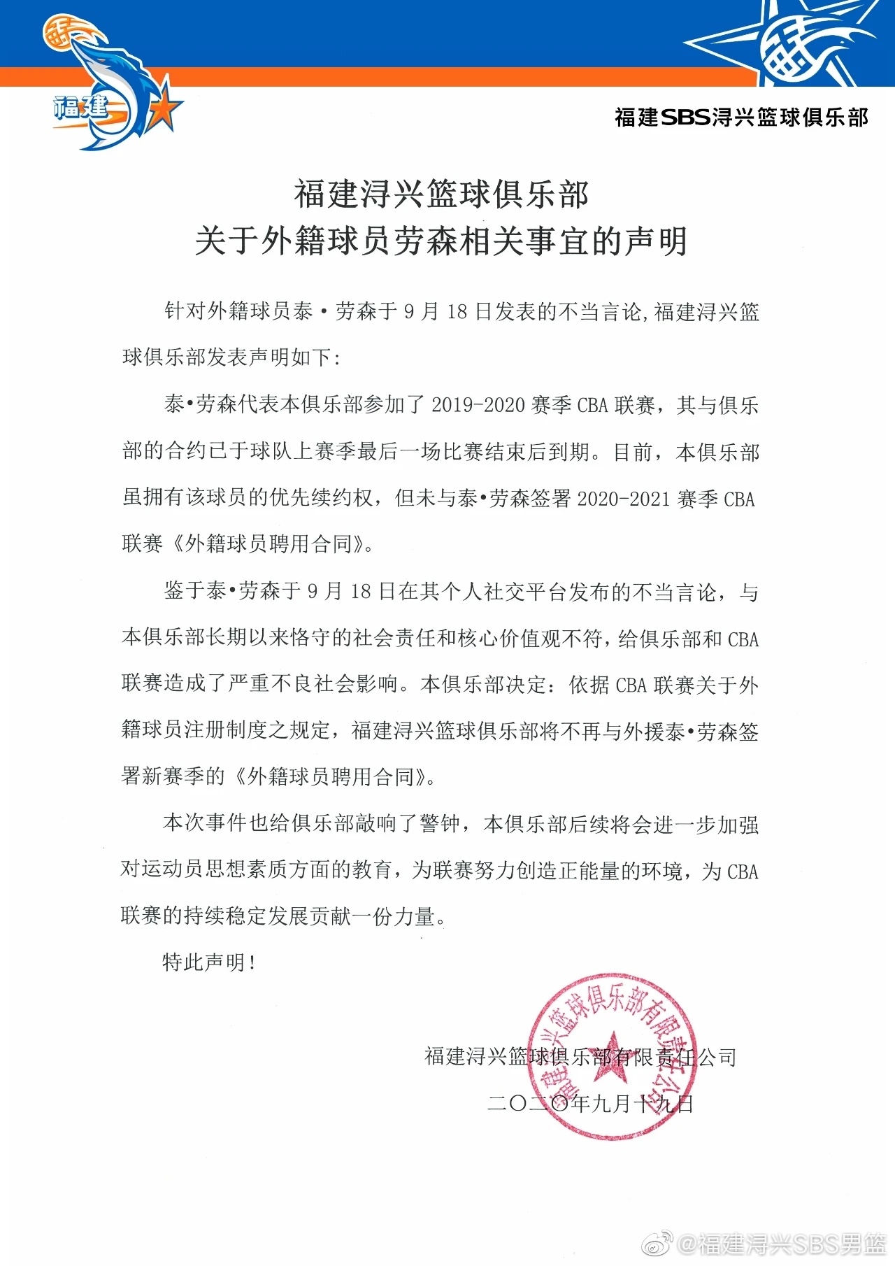 福建队在声明中写道:“本俱乐部虽拥有该球员的优先续约权,但未与泰·劳森签署2020-2021赛季CBA联赛《外籍球员聘用合同》。鉴于泰·劳森于9月18日在其个人社交平台发布的不当言论,与本俱乐部长期以来恪守的社会责任和核心价值观不符,给俱乐部和CBA联赛造成了严重不良社会影响。本俱乐部决定:依据CBA联赛关于外籍球员注册制度之规定,福建浔兴篮球俱乐部将不再与外援泰·劳森签署新赛季的《外籍球员聘用合同》。”