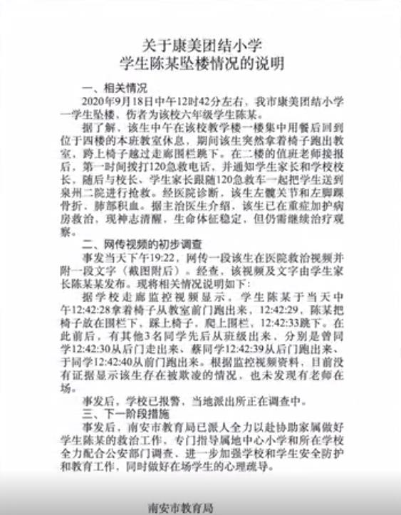 针对该事件,南安市教育局回应称,根据监控视频,尚未发现有证据显示该男生存在被欺凌情况。事发后,教育局已派人全力协助家属做好学生的救治工作。目前学校已报警,当地警方正在调查中。