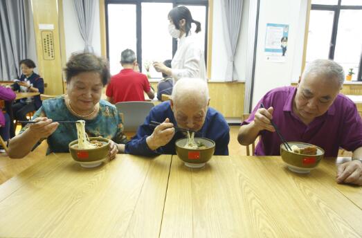 “在国庆节,我们这些伴随新中国长大的老人一起吃国庆面,真是非常高兴!”在吃面之前,金山区石化街道敬老院的老人们舞动着手中的国旗,高声唱起《我和我的祖国》。回想起曾经的岁月,看到国家日新月异的变化,他们深感自豪和骄傲。