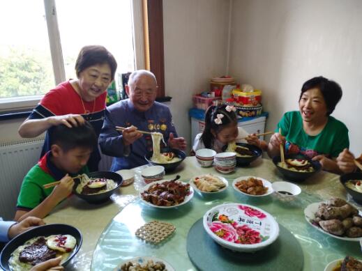 2020年10月1日,鲍奇(右三)和家人一起吃国庆面。龙钢 摄