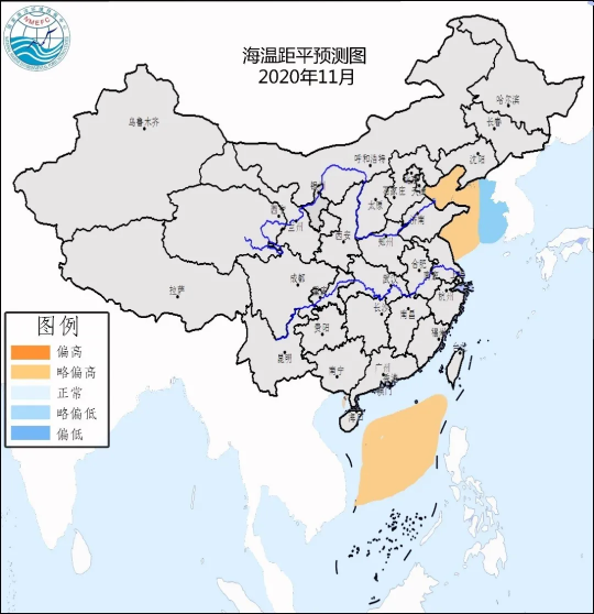 11月份,赤道东太平洋将处于拉尼娜状态,渤海、黄海中西部、南海北部海温较常年同期略偏高,黄海东部海温较常年同期略偏低,东海、南海南部海温接近常年。