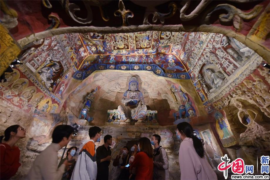 2020年11月3日,杭州市民和游客在浙江大学艺术与考古博物馆的展厅内观赏采用3D打印技术复制的云冈石窟“音乐窟”。位于杭州的浙江大学艺术与考古博物馆从11月1日起恢复对社会公众开放,而正在该馆展出的全球首个可移动3D打印石窟-云冈石窟“音乐窟”也首次面向社会公众展出 ,观众在参观时可触摸3D打印的云冈石窟“音乐窟”,让人们能近距离感受中华传统文化艺术与现代科技结合带来的独特魅力。龙巍/IC photo