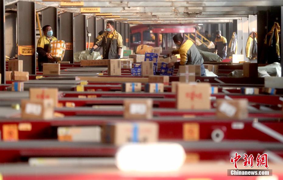 11月11日,位于河北香河的韵达快递华北转运中心内数十条传送带同时开启。据中国国家邮政局消息,“双十一”期间(11月11日至16日)将出现快递业务旺季峰值,预计日均快递业务量达4.9亿件,约是日常业务量的2倍。中新社记者 张宇 摄