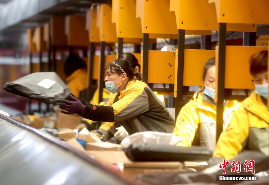 11月11日,位于河北香河的韵达快递华北转运中心员工分拣快递。据中国国家邮政局消息,“双十一”期间(11月11日至16日)将出现快递业务旺季峰值,预计日均快递业务量达4.9亿件,约是日常业务量的2倍。中新社记者 张宇 摄