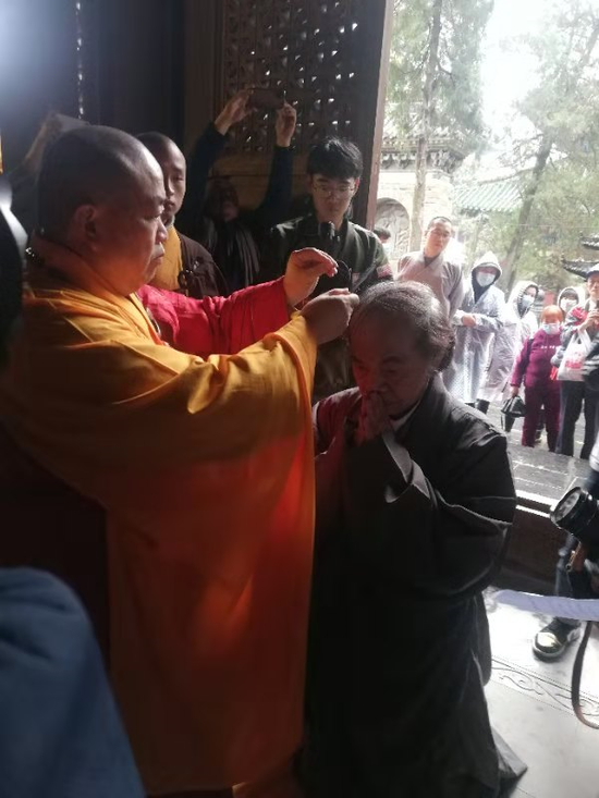 上午9时,蔡志忠先生的剃度仪式在少林寺藏经阁举行,永信大和尚住持授受皈依,两序大众见证。咔、咔、咔,三剪下去,三绺青丝瞬息而落……而后,蔡志忠先生著衣僧袍,转身而为佛门沙弥释延一。