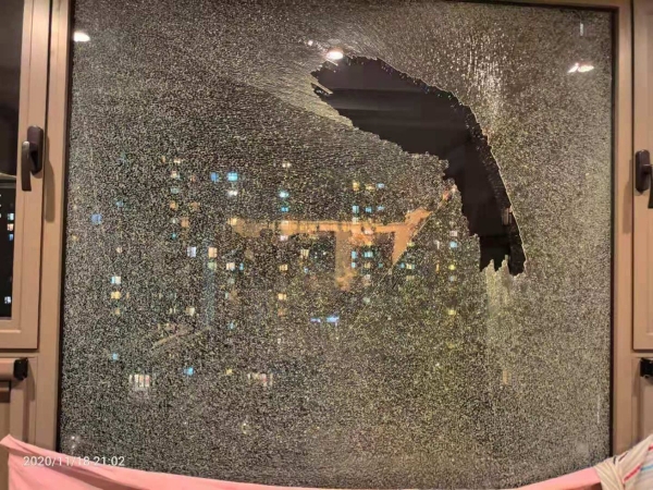 “‘嘣’地一声巨响,客厅窗户的大玻璃竟毫无征兆地自爆了,把全家人都吓了一跳……”回想起11月17日发生的事,9号楼的业主李女士仍心有余悸。