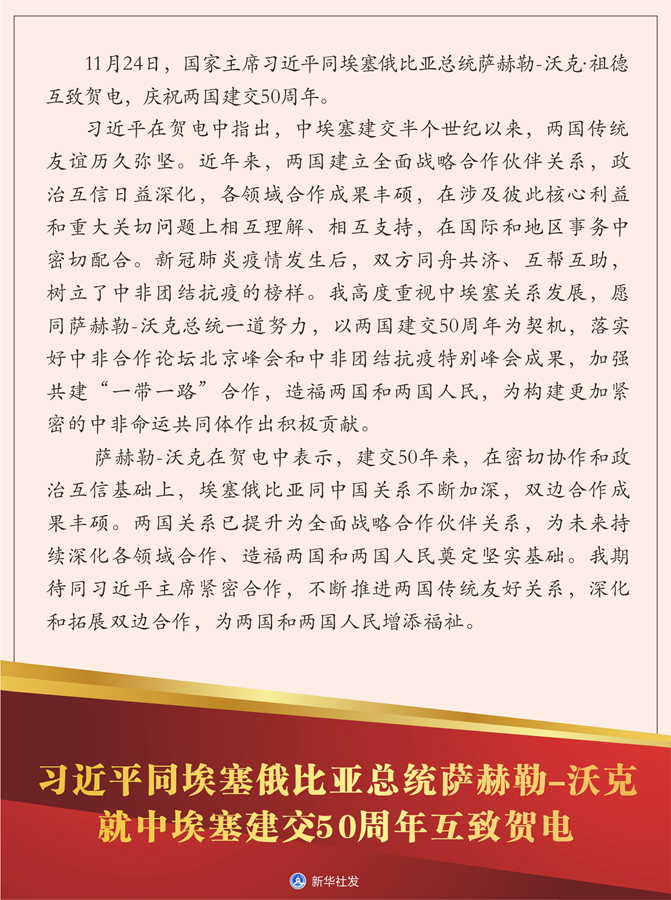 新华社北京11月24日电 11月24日,国家主席习近平同埃塞俄比亚总统萨赫勒-沃克·祖德互致贺电,庆祝两国建交50周年。