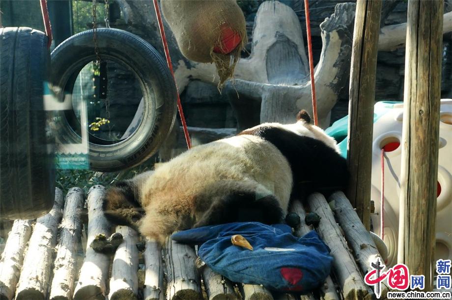 北京动物园冬日大熊猫的幸福生活:晒太阳睡大觉