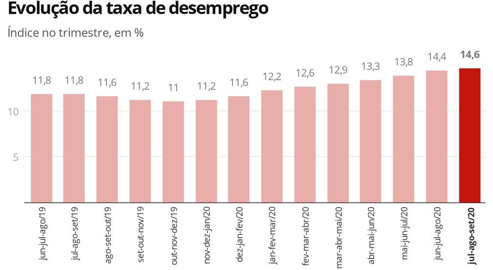 △2019年6月至2020年9月,巴西每三个月平均失业率(图片来源:巴西地理和统计研究院)