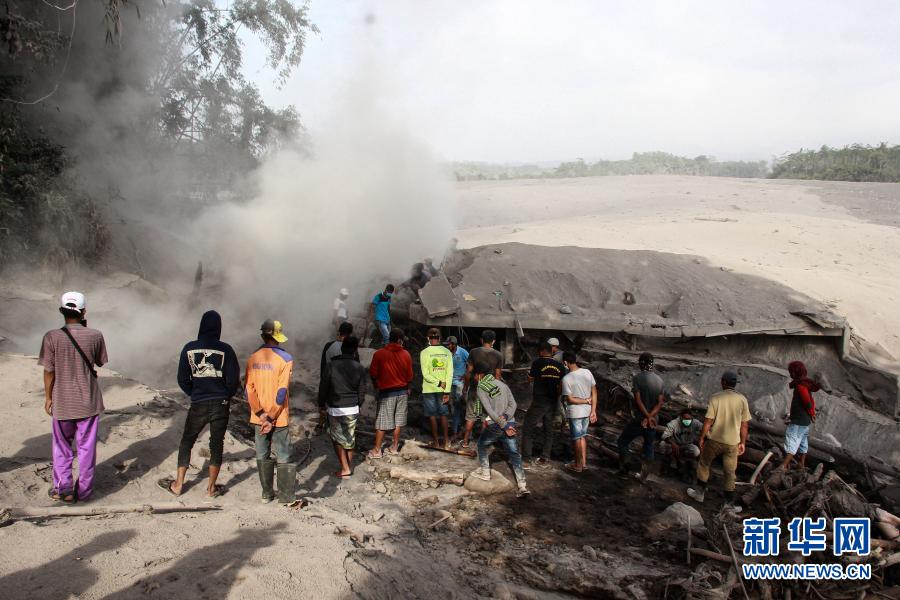 12月2日,在印度尼西亚东爪哇省卢马姜地区,当地居民站在一座被火山灰掩埋的房屋前。新华社发(巴育摄)