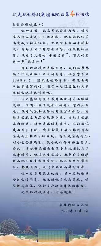 亲爱的嫦娥五号,你知道吗,你在月球的这两天,很多家人陪你度过了不眠之夜。现在你已经圆满完成了钻具钻取、机械臂表取和采样封装,月球上的工暂告段落。你沉稳的操作,展示了扎实的“中国功夫”。家人们要说一声“你真棒!”