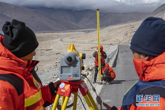 国测一大队队员在西藏定日县曲当乡境内进行水准测量(4月18日摄)。新华社记者 孙非 摄