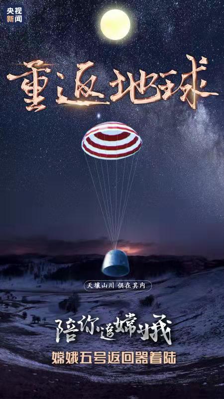 记者从国家航天局获悉,北京时间12月17日1时59分,探月工程嫦娥五号返回器在内蒙古四子王旗预定区域成功着陆,标志着我国首次地外天体采样返回任务圆满完成。