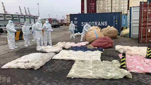 天津新港海关查获的“洋垃圾”旧被子。杨海宁摄
