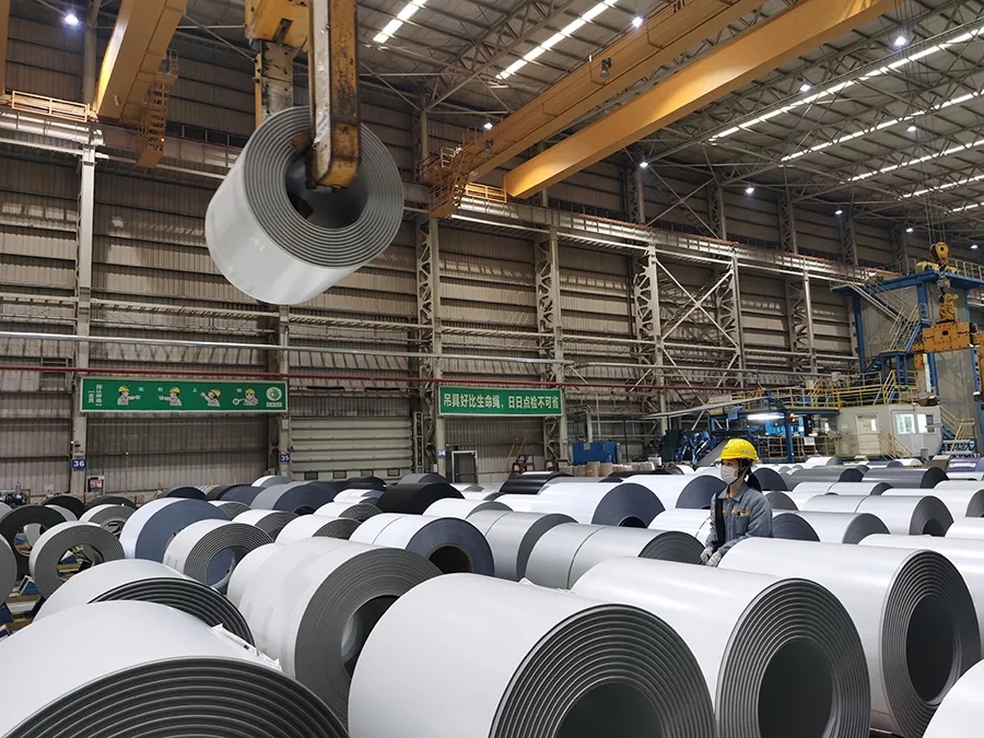 穿梭在“钢铁丛林”中,四周是一派热闹的生产景象。经过层层加工的钢板从生产线尾端的取卷机中一卷卷吐出,又被天花板上垂下的机械臂运送到钢卷存放区,整齐地排列在地上,等待包装、运输。