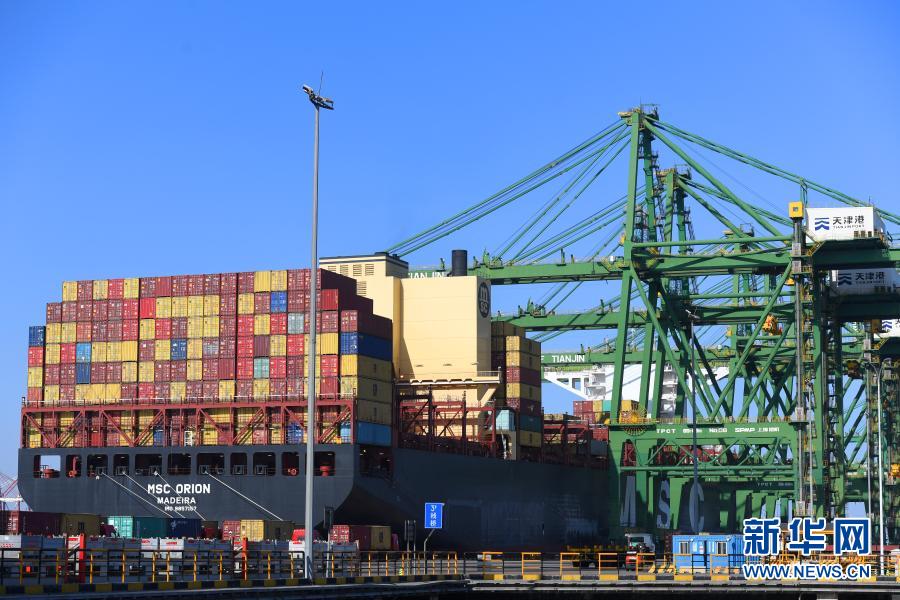 1月11日,一艘货轮停靠在天津港太平洋国际集装箱码头。