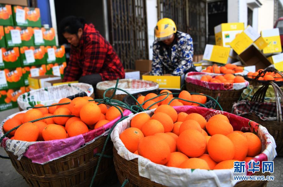 1月11日,奉节县安坪镇三沱村村民在对脐橙进行分拣、装箱。