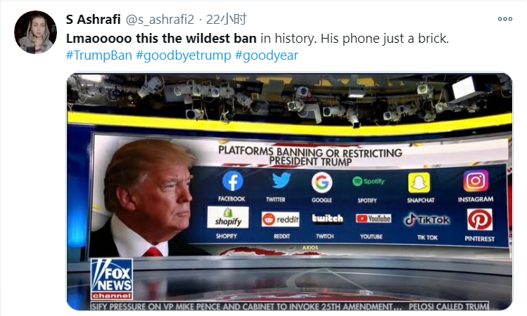 福克斯新闻罗列出已“封禁”特朗普账号的网络社交平台,包括脸书、推特、谷歌、阅后即焚等数十家平台。