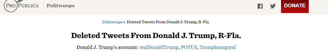 总部在纽约的非盈利新闻组织ProPublica为特朗普的推特账号内容专设了一个网页,完整保留了特朗普2015年6月至2021年1月8日间的所有消息。