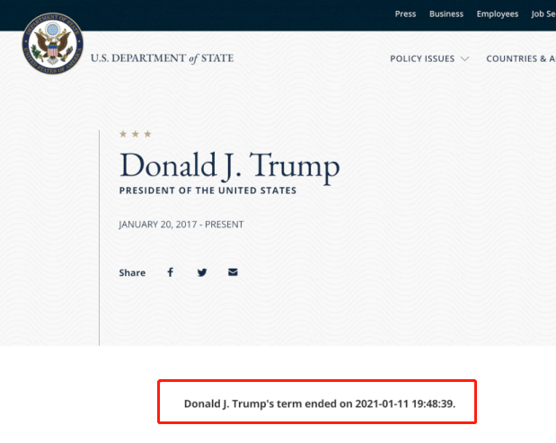 距离美国当选总统拜登宣誓就职还有9天之际,美国国务院官网突然于当地时间11日修改了美国总统特朗普、副总统彭斯的个人资料,将两人任期结束时间均改为1月11日。