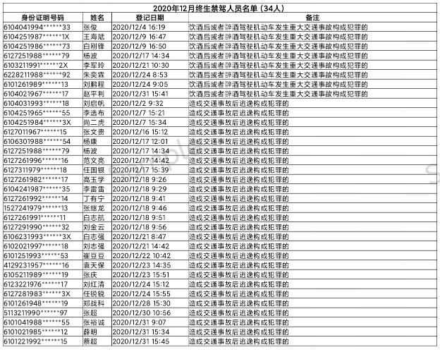 记者从陕西省公安厅交警总队了解到,2020年12月份终生禁驾人员名单公布,陕西省34名驾驶人被终生禁驾。