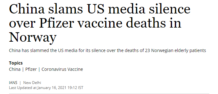 《印度商业标准报》1月16日发布了一篇标题为《在挪威,辉瑞新冠疫苗致23死,中国狠狠扇了沉默的美媒一耳光》的文章。