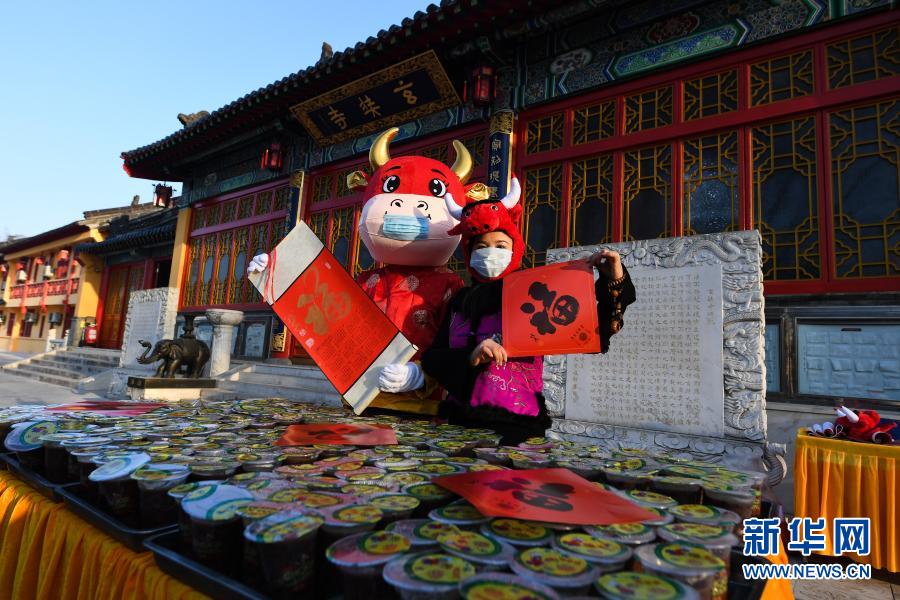 1月20日,在南京玄奘寺,义工在准备的腊八粥前送祝福。当日是农历腊八,南京玄奘寺为附近社区、养老院等准备腊八粥,由代表统一领取带回,分发给市民。新华社记者 季春鹏 摄