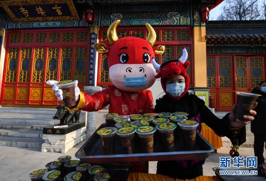 1月20日,在南京玄奘寺,义工展示准备的腊八粥。新华社记者 季春鹏 摄