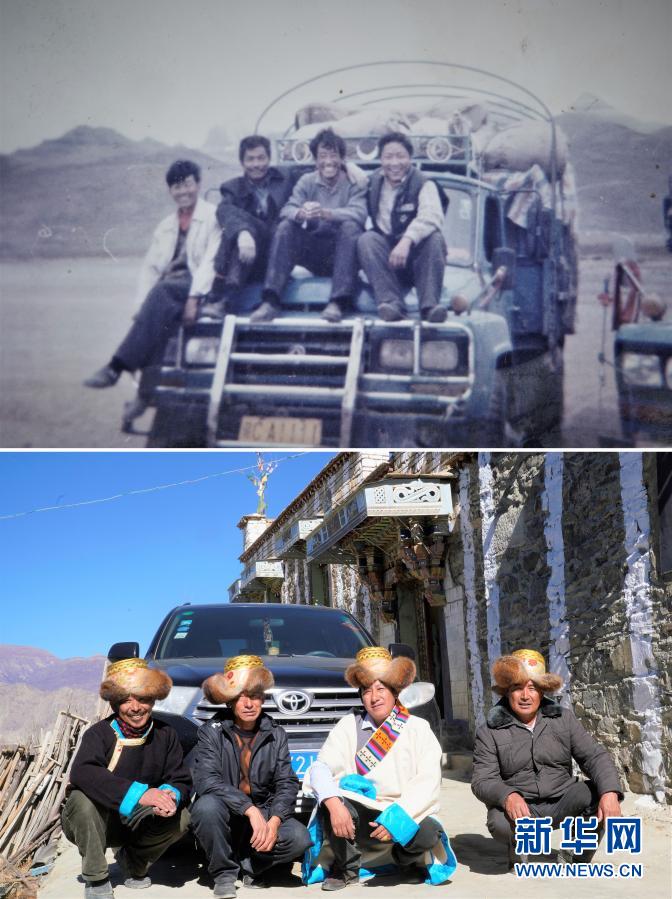 拼版照片:上图为1994年,24岁的强巴(右二)和他的三个兄弟在西藏阿里地区跑运输时,在自己购买的“东风”牌运输车上合影(新华社发 强巴供图)。