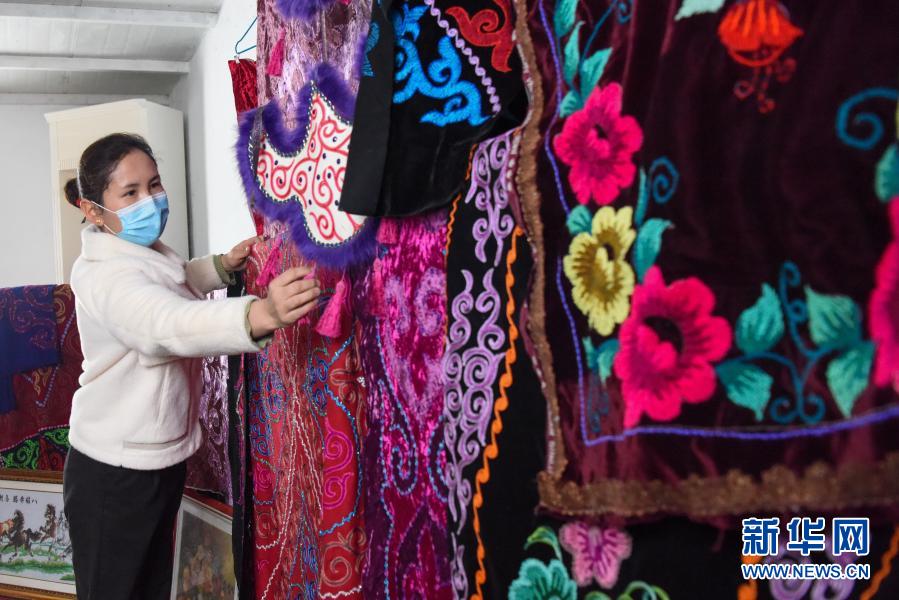 1月23日,在吉木萨尔县白泉村刺绣专业合作社,绣娘在布置产品展示区。