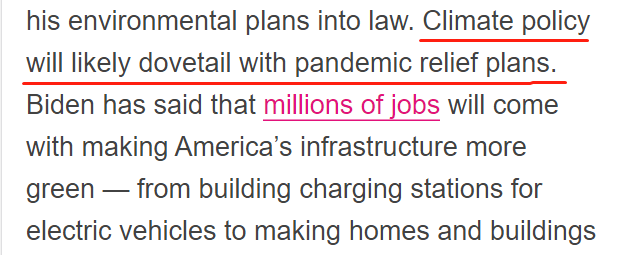 因为按照拜登的说法,美国的一系列气候政策,会使美国的基础设施更加绿色,更加环保,同时(新型能源产业等)还将给美国带来数以百万计的就业机会——例如,为新能源汽车建造充电站、住宅和建筑物节能化。