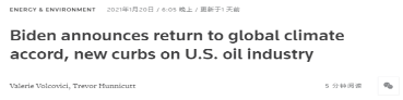 果真,周三下午,拜登一抵达白宫椭圆形办公室,就开始兑现将气候变化放在执政首位的承诺——签署了涵盖一系列政策的全面行政命令,包括承诺减少温室气体排放等。