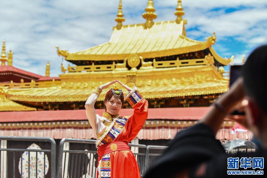 游客在西藏拉萨大昭寺金顶前留影(2020年7月2日摄)。新华社记者 晋美多吉 摄