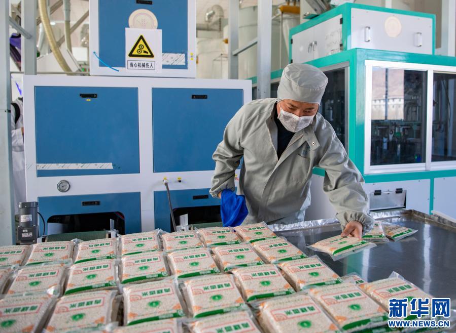西藏拉萨达孜工业园区一家青稞食品生产企业的工作人员在摆放加工好的青稞产品(2020年2月17日摄)。新华社记者 孙非 摄