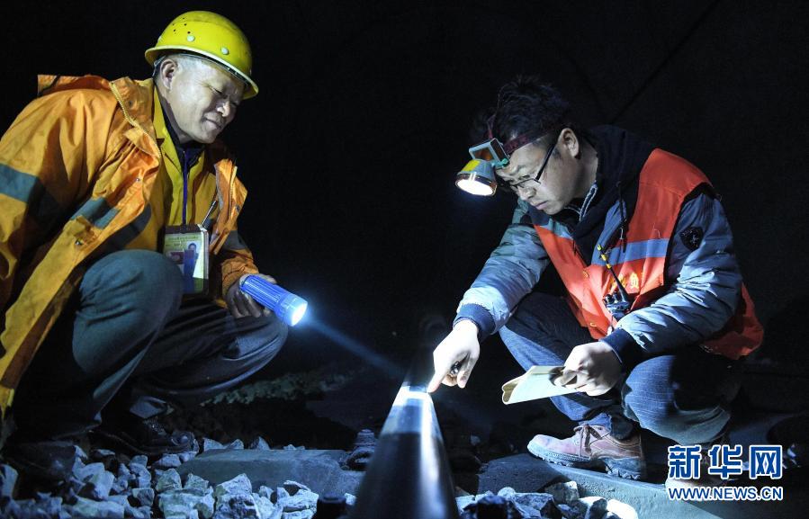 看守工廖成根(左)与工长罗昌伟检查隧道内钢轨轨面状态(1月30日摄)。新华社记者 张爱林 摄