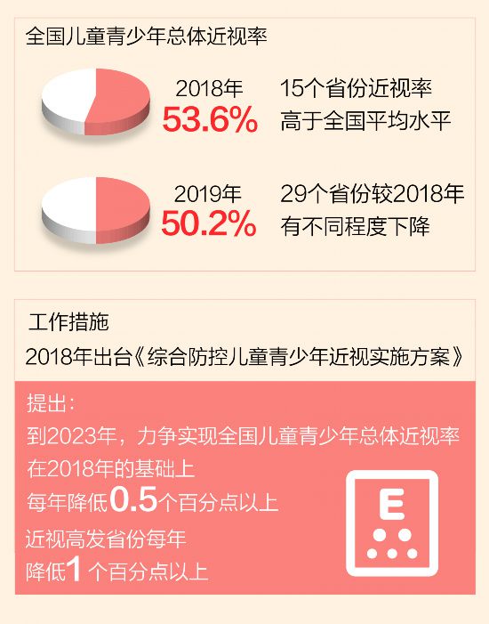最新一次全国儿童青少年近视情况调查结果显示,2019年全国儿童青少年总体近视率为50.2%,较2018年下降了3.4%,29个省份的近视率有不同程度下降。