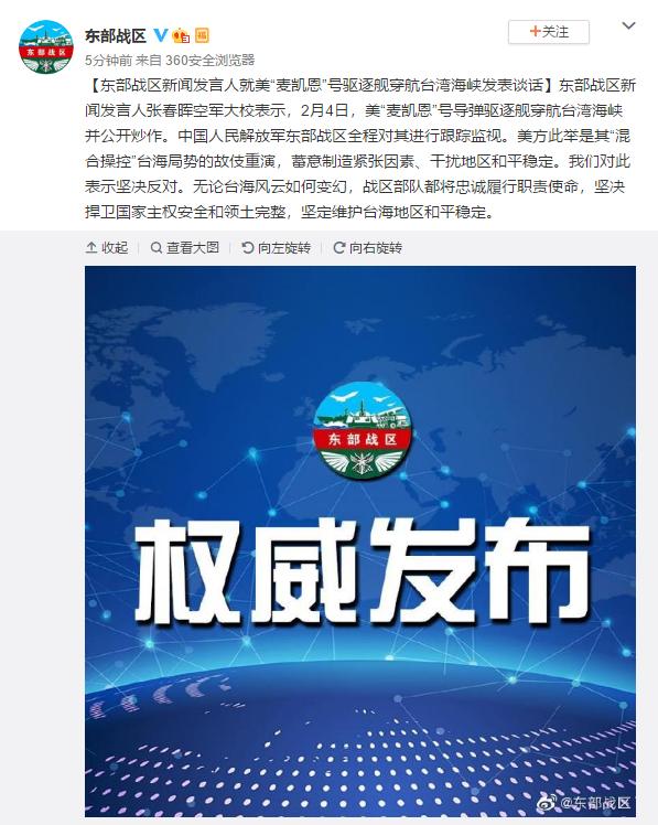 【东部战区新闻发言人就美“麦凯恩”号驱逐舰穿航台湾海峡发表谈话】东部战区新闻发言人张春晖空军大校表示,2月4日,美“麦凯恩”号导弹驱逐舰穿航台湾海峡并公开炒作。中国人民解放军东部战区全程对其进行跟踪监视。美方此举是其“混合操控”台海局势的故伎重演,蓄意制造紧张因素、干扰地区和平稳定。我们对此表示坚决反对。无论台海风云如何变幻,战区部队都将忠诚履行职责使命,坚决捍卫国家主权安全和领土完整,坚定维护台海地区和平稳定。