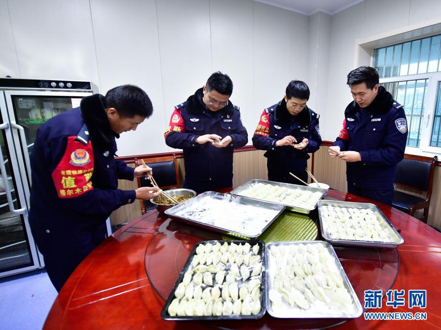 农历腊月二十三“小年”这一天,驻守天路的青藏铁路公安局格尔木公安处沱沱河站派出所的民警们和往年一样完成例行巡线后,自己动手和面包饺子过“小年”。沱沱河站派出所担负着青藏铁路582公里线路、27座车站的安全保卫任务。管辖铁路平均海拔4500米,年平均气温在0℃以下,空气含氧量仅为内地的50-60%,被称为“生命的禁区”。新华社记者 张龙 摄