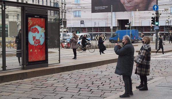 作为中国驻米兰总领馆农历新年庆祝活动的一部分,2月1日至14日,米兰市多个地铁站及公交站的电子显示屏中,剪纸风格的牛年生肖与祥云元素结合的动画循环播放,吸引了不少当地民众驻足观看。