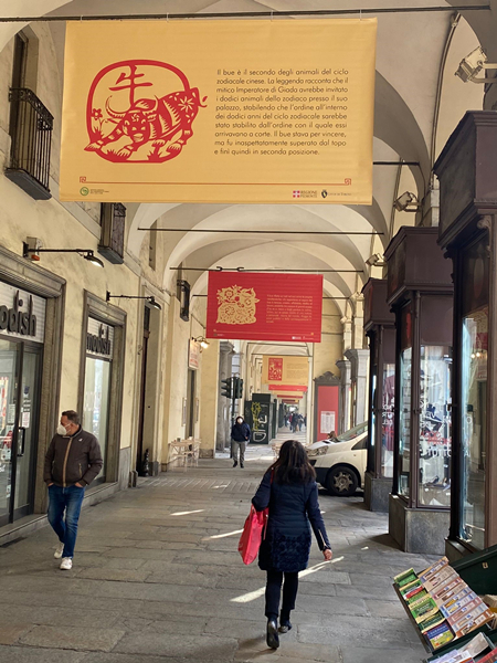 从2月5日至21日,都灵大学孔子学院在皮埃蒙特大区支持下,于都灵市著名的波河路两侧的拱廊内布置了主题横幅展览,精选春节诗歌及相关文学作品以中文和意大利译文呈现,旨在向市民展示春节传统文化习俗。