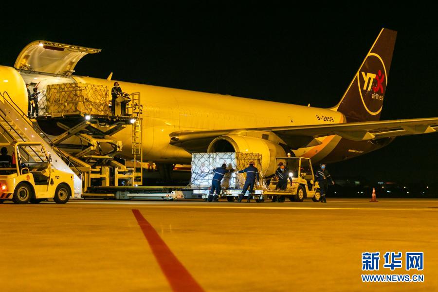 2月8日,在老挝首都万象,工作人员卸载中国援助老挝的新冠疫苗。中国政府援助老挝的新冠疫苗8日凌晨由中国圆通速递货运包机运抵万象,老挝卫生部长本贡和中国驻老挝大使姜再冬到机场迎接。新华社发(凯乔摄)