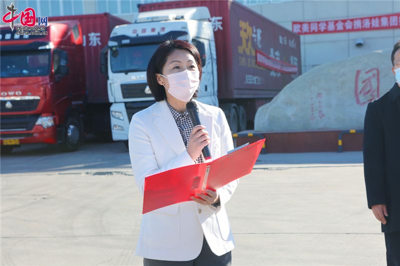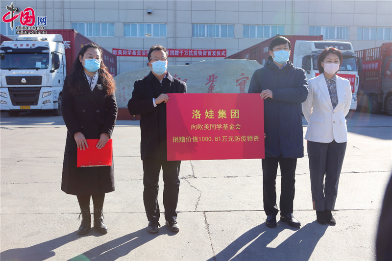 中国网/中国发展门户网讯2月7日,欧美同学基金会携洛娃集团捐赠千万抗疫物资首发仪式在北京举行。洛娃集团董事副总裁赵建利向欧美同学基金会捐赠价值1000.81万元防疫物资,欧美同学基金会理事长助理李军接受捐赠。爱心防疫物资春节前后分两个批次送达,第一批满载防疫物资和社会各界关爱祝福的车队从首都温暖出发。