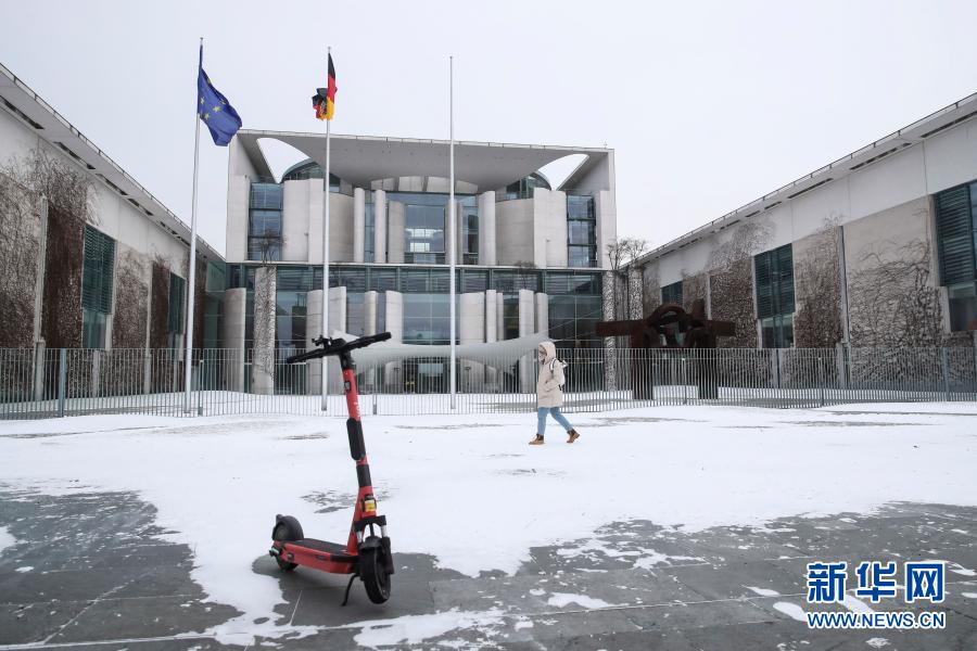 2月7日,在德国首都柏林,一名行人经过德国总理府。新华社记者单宇琦摄